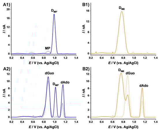 For 6-mercaptopurine, the DP voltammogram recorded in the anodic potential range before irradiation showed one peak at EMP = +0.88 V, which disappeared after exposure to the solar simulator, while a new anodic signal occurred at EMPss = +0.99 V, as shown in Figure 6(A1). The effect of MP degradation on DNA was investigated, and the voltammogram recorded after irradiation showed, on the one hand, a peak characteristic to the MP degradation product. On the other hand, the dAdo oxidation peak increased, and dGuo maintained the same current when compared to the voltammogram recorded in the same solution before irradiation, as shown in Figure 6(A2). This effect could be associated with a preferential interaction between the MP degradation product and the adenine reach segments in the DNA structure, leading to conformational modifications and the exposure of adenine residues to the electrodes surface, thus facilitating their oxidation.