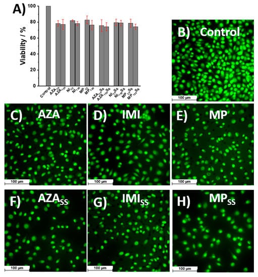 The fluorescence images obtained for the L929 cell culture incubated with AZA, IMI, and MP before and after their exposure to the solar simulator revealed that all the cells presented a well-defined nucleus, and the only difference observed between the samples was the number of viable cells, as shown in Figure 7B–H. Compared with the control experiments, as shown in Figure 7B, the number of viable cells decreased slightly after incubation with AZA, IMI, and MP, both for the fresh solutions and for those exposed to the solar simulator, as shown in Figure 7C–H, and the lowest density of viable cells was obtained for the AZA and MP solutions exposed to the solar simulator, as shown in Figure 7F,H, which was in agreement with the results obtained by the MTS assay, as shown in Figure 7A.