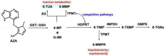 Azathioprine, one of the oldest pharmacologic immunosuppressive agents, was developed in 1957 by the scientists Gertrude Elion and George Hitchings who received, and shared with James W. Black, the Nobel prize in Physiology or Medicine in 1988 for their discoveries of important principles for drug treatment [,,]. The development of azathioprine as a purine-mimic antimetabolite represented the successful results of the therapeutic improvement of 6-mercaptopurine (6-MP) through sulfur-substituted compounds []. Azathioprine became the medication used to prevent the rejection of transplanted organs as well as for the treatment of autoimmune diseases [,,,,]. It presents a high adsorption rate from the gastrointestinal tract, the serum half-life is up to 0.5 h, the biologic half-life is approximately 24 h, and 45% of the drug is excreted in the urine, the remaining portion being metabolized to 6-MP in red blood cells through the action of glutathione []. Subsequently, 6-MP is enzymatically converted into 6-TUA, 6-MMP, and 6-TGNs, see Scheme 1. 6-TGNs are thioguanine nucleotides containing different numbers of phosphate groups, which are capable of incorporating into replicating DNA, a process which blocks the de novo pathway of purine synthesis and inhibits DNA, RNA, and protein synthesis [,].