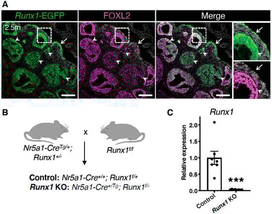 In humans, the main cause of adult GCT (97%) is a point mutation leading to the C134W substitution in the transcription factor FOXL2 []. This mutation appears to modify FOXL2 functions as a transcription factor [,,]. Our lab previously demonstrated that transcription factors RUNX1 and FOXL2 play redundant roles in fetal granulosa cell differentiation by directly controlling the expression of common genes []. Considering this shared role between FOXL2 and RUNX1 in granulosa cell gene regulation, it is possible that Runx1 misexpression contributes to granulosa cell tumors as well. RUNX1 is expressed at variable levels in human adult GCTs []. It is worth noting that combined comparative genomic hybridization and transcriptomic analyzes of human GCTs revealed that the RUNX1 gene was recurrently mutated in these tumors []. This suggests that, together with FOXL2 mutation, alterations of the RUNX1 gene may contribute to GCT development in humans.