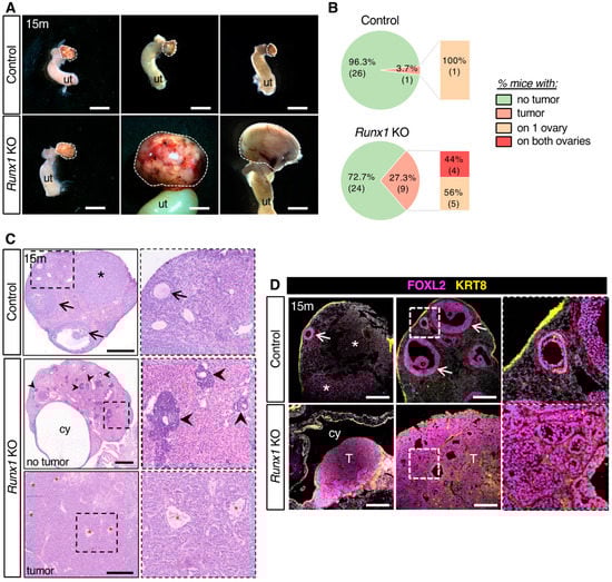 2.2. Loss of Runx1 Leads to Increased Prevalence of Ovarian Tumors