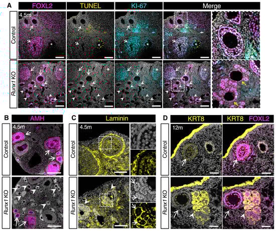 To further assess the characteristics of the follicle-like lesions in 4.5-month-old ovaries, we performed immunostaining for the granulosa cell marker FOXL2 and the proliferation marker KI-67 and detection of cell death using the Terminal deoxynucleotidyl transferase dUTP nick end labeling (TUNEL) assay. Control ovaries contained growing follicles with FOXL2+/KI-67+ proliferating granulosa cells and some atretic follicles with TUNEL+ dying granulosa cells (Figure 4A). In Runx1 KO ovaries, some normal growing follicles and atretic follicles were also observed (Figure 4A). The follicle-like lesions were FOXL2+ (Figure 4A), confirming that they arose from ovarian follicles. These aberrant follicles were devoid of oocytes, replaced by an empty eosinophilic cavity (Figure 3B insets and Figure 4A). Considering that many of these aberrant follicles showed an asymmetrical organization of FOXL2+ cells with only one or two cell layers on one side, we suspected that these aberrant follicles arose from primary or early secondary follicles (Figure 4A inset). These abnormal granulosa cells were negative for both KI-67 and TUNEL, indicating that they were not proliferating as normal follicular cells do nor were they undergoing cell death. Anti-Müllerian hormone (AMH), a marker for granulosa cells of primary to early antral follicles, was detected in normal secondary follicles of control and Runx1 KO ovaries (Figure 4B). However, granulosa cells composing the follicle-like lesions in Runx1 KO ovaries failed to express AMH (Figure 4B), indicating defects in granulosa cell differentiation at the primary follicular stage. Immunofluorescence for laminin revealed that control ovary follicles were fully surrounded by a single basal membrane composed of laminin (Figure 4C). In contrast, the follicle-like lesions in Runx1 KO ovaries were not fully surrounded by a single basal membrane but instead showed laminin deposition around each rosette structures composing these lesions (Figure 4C inset). Overall, the absence of cell proliferation, AMH expression and proper basal membrane deposition suggested some defects in the differentiation and function of the granulosa cells in these abnormal follicle-like lesions in Runx1 KO ovaries. Finally, in older mice (12–15 months), a subset of these FOXL2+ follicle-like lesions also expressed KRT8, a marker usually found in the epithelium and weakly detected in granulosa cells of small secondary follicles (Figure 4D). Expression of KRT8 or other keratins was also observed in subsets of abnormal granulosa cells in other mouse models for granulosa cell tumors [,] and in KGN cells, a cell line originating from a human adult granulosa cell tumor []. These findings together indicated that these abnormal granulosa cells acquired some epithelial-like characteristics.
