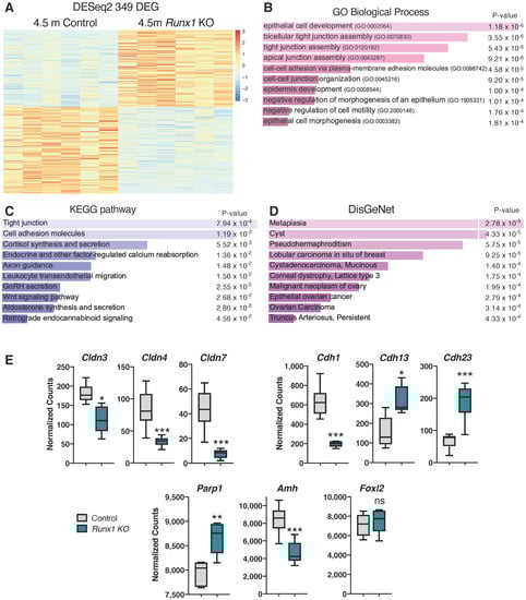 To gain more insights into the early consequences of Runx1 loss in adult ovaries, we performed RNA-seq on both Runx1 KO and control ovaries at 4.5 months of age (n = 6/genotype). Gene expression analysis identified 349 genes that were differentially expressed (DEG) between the two groups (Figure 5A; Supplementary Dataset S1; Supplementary Figure S2A,B). Among these 349 genes, 164 were upregulated and 185 were downregulated in Runx1 KO ovaries. Gene ontology (GO) analyses revealed that the top mis-regulated GO biological processes were related to epithelial cell development/morphogenesis, tight junctions, and cell-cell adhesion (Figure 5B). For instance, there was significant downregulation of tight junction Claudin (Cldn) genes Cldn3/4/7 (Figure 5E and Supplementary Figure S2A,B). Tight junctions are important for cell adhesion, polarity, growth, migration, and paracellular permeability, and their destabilization is associated with malignancy []. The Kyoto Encyclopedia of Genes and Genomes (KEGG) pathway analysis also revealed mis-regulation of tight junctions and cell adhesion (Figure 5C). It is unclear whether mis-regulation of genes in epithelial cell development/morphogenesis and tight junctions involves the surface epithelium itself or the granulosa cells, as adult granulosa cells originate from the ovarian surface epithelium during neonatal development of the ovary [,]. It is, however, worth noting that aged Runx1 KO ovaries displayed irregular ovarian surface epithelium with some invaginations (Supplementary Figures S1 and S3).
