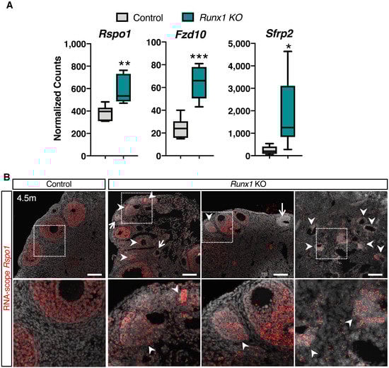 Upregulation of genes of the Wnt signaling pathway in Runx1 knockout ovaries. (A) Examples of significantly differentially expressed genes in Runx1 KO vs. control ovaries at 4.5 months. Boxplots represent the DESeq2-normalized counts from RNA-seq data. Values are presented as mean ± SEM (n = 6/genotype); * p < 0.05; ** p < 0.01; *** p < 0.001. (B) RNA-scope for the Rspo1 probe in control and Runx1 KO ovaries at 4.5 months (n = 4/genotype). Arrowheads point to Rspo1+ follicle-like lesions. Arrows point to follicle-like lesions with little to no Rspo1 expression. Scale bars: 100 μm.
