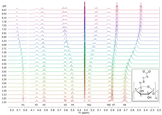 pH-dependent series of 1H NMR spectra of Suα-CD, with structure and atom numbering of the compound and assignment of the NMR signals (600 MHz, 298 K, H2O:D2O = 9:1).