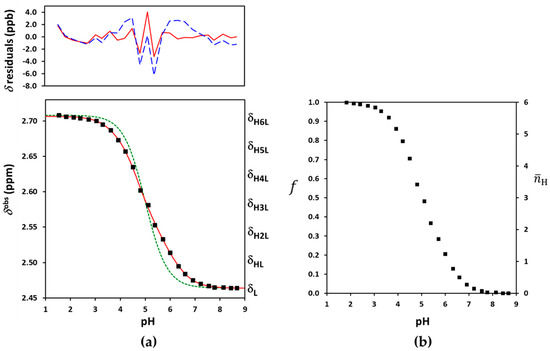 It was demonstrated earlier [43,44,45] that fitting of an Equation (11) type ratio of polynomials yields unequivocal results only for the coefficients. Any attempt to compute the constituent constants led to overparametrization of the regression for more than triprotic molecules. Fitting the combination of Equations (4) and (11) to the experimental dataset of Suα-CD yielded an excellent fit (Figure 3a) and statistically sound results for the iterated log , and parameters (see Tables S3 and S4). The log coefficients were then used to back-calculate the log values by Equations (12)–(17), the differences of which yielded the stepwise log Ki constants listed in Table 1. The resulting macroconstants, quality of fit and even the residual distributions coincide for the ED-macro and Q-fitting models, the two models are mathematically isomorphous.