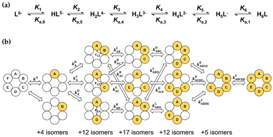 In the microscopic protonation scheme in Figure 4b, all protonation isomers of the HiL macrospecies (i = 1 to 5) are considered as distinct entities. The hexabasic Suα-CD ligand has 26 = 64 protonation microspecies, whose formation are interconnected by 6 × 25 = 192 microconstants , whose x upper index identifies the protonating, the lower index y (if any) the already protonated carboxylate(s). Fortunately, molecular symmetry significantly reduces the number of constitutionally different microspecies. For instance, the following isomers protonated at two adjacent carboxylate groups are indistinguishable: AB ≡ BC ≡ CD ≡ DE ≡ EF ≡ FA. Thus, the multiplicity of microspecies AB becomes six. Considering all such symmetry-based simplifications, a reduced microscopic scheme with only 13 different microspecies can be constructed (see Figure S26) and certain microconstants coincide, e.g., or , etc. A micro-formation constant denoted by [43,45] is defined for each microspecies, which reads, e.g., for microspecies ABD as follows:
