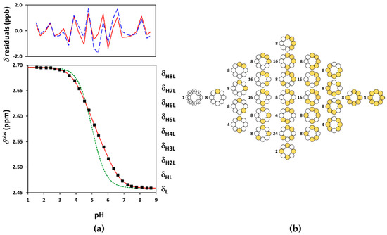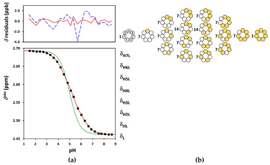 As a first approximation, the basicity of a given carboxylate is assumed to change negligibly upon successive protonation of the five others. This assumption seems to be plausible, considering the large covalent and spatial distances among the carboxylates. The formation constants of all conceivable protonation isomers of HiL simply become and can be termed as group constant in this statistical case [51]. Plugging these values into Equations (11)–(17) and using Equation (4) for nonlinear regression yields the results in Tables S5 and S6. However, the quality of fit in Figure 3a is clearly unsatisfactory, indicating that the six carboxylates of Suα-CD do not obey the statistical case of independent protonation.