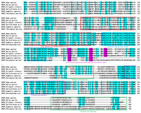 Sequence alignment of lamprey BCAP homologs with several typical BCAP molecules of higher vertebrates by using Clustal X program. The accession numbers of the sequences are listed in Table S1. The identical amino acid residues among BCAP sequences are marked in light blue. The functional domains such as Dof, BCAP, and BANK (DBB) motif, anchor protein repeat motif, proline rich domain and coiled-coil domain are marked by red, blue, green and purple frames, respectively. The conserved immunoreceptor tyrosine-based activation motifs are indicated by pink letters.