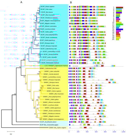 The phylogeny and conserved motif analysis of BCAP and BANK1 protein families. (A). The phylogenetical tree was reconstructed using the Neighbor-Joining method. The percentage of replicated trees in which the associated taxa clustered together in the bootstrap test (1000 replicates) is shown next to the branches. The tree is drawn to scale, with branch lengths in the same units as those of the evolutionary distances used to infer the phylogenetic tree. The BCAP and BANK1 clusters are shaded with light blue and yellow colors, respectively. The accession numbers of protein sequences are listed in Table S1. (B). The conserved motif analysis was conducted by using an online tool Multiple Em for Motif Elicitation (https://meme-suite.org/meme/index.html, accessed on 20 April 2022). The 20 conserved motifs searched among 45 sequences are indicated with different colors and their sequences are shown in Table S4. The unique conserved motif combination in BCAPs is marked by a dotted line, while in BANK1 it is marked by a dashed line.