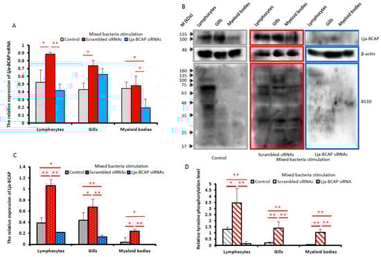 The successful knockdown of Lja-BCAP expression provides the possibility for further exploring its function in the lamprey immune response. The significant up-regulation of Lja-BCAP protein was detected in the peripheral blood lymphocytes (p < 0.01), gills (p < 0.05) and supraneural myeloid bodies (p < 0.05) after mixed bacteria stimulation in the negative control group, and these up-regulations were blocked after Lja-BCAP knockdown (Figure 3B,C). Our findings at protein level were coincident with the results of Hirano et al. at the transcriptional level. They performed transcriptomics on VLRA+, VLRB+, TN and VLRC+ lymphocytes and found that BCAP is expressed in all of them, with the strongest expression found in VLRB+ lymphocytes []. In higher vertebrates, the early events after BCR and TCR activation are associated with tyrosine phosphorylation and dephosphorylation of Src-family protein tyrosine kinases []. The phosphorylation of two tyrosine residues on ITAM of BCAP is also critical for the activation of the PI3K p85 subunit []. Therefore, tyrosine phosphorylation is considered one of the key steps in BCR or TCR signal transduction in vertebrates []. Thus, a Mouse Monoclonal Antibody 4G10 was applied to check the tyrosine phosphorylation levels after the knockdown of Lja-BCAP []. In the negative control group, the tyrosine phosphorylation levels in peripheral blood lymphocytes, gills and supraneural myeloid bodies after mixed bacteria stimulation are obviously higher than those in the control group, and they were all attenuated after knockdown of Lja-BCAP (Figure 3B). Thus, it can be concluded that Lja-BCAP is functionally involved in the lamprey anti-bacterial immune response.