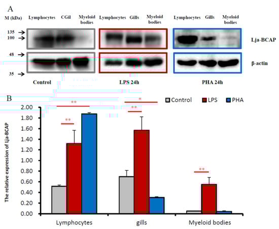 Relative expression levels of Lja-BCAP in immune-related tissues after LPS and PHA stimulation. (A) Western blotting method was used to detect the expression of Lja-BCAP in immune-related tissues after LPS and PHA stimulation, respectively. Lampreys were stimulated by normal saline, LPS or PHA for 24h, respectively, as described in Materials and Methods; (B) The statistical graph of the results of Western blotting. The data shown in the figure are all carried out in 3 sets of parallel experiments for each group (n = 3). The experimental results are expressed as “mean ± SD”. All data are tested by t-test, * means significant difference (p < 0.05), ** means extremely significant difference (p < 0.01).