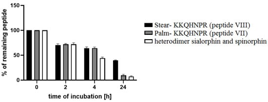 Conjugates sialorphin with a short lipopeptides: Palm-Lys-Lys (peptide VII) and Stear-Lys-Lys (peptide VIII) and heterodimer sialorphin and spinorphin stabilities in human plasma. The means of the % of remaining peptide with a standard deviation are presented.