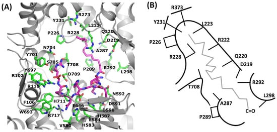 The result of the docking simulation of Stear-KKQHNPR ligand to human NEP structure. (A) Protein shape was colored gray. The interacting residues were described with one letter abbreviation and colored green. The ligand was colored purple. (B) Schematic representation of the fatty acid aliphatic chain binding pocket. One letter abbreviation was used to point to the interacting residues. The location (direction) of the sidechains constituting the binding pocket was shown as sticks.