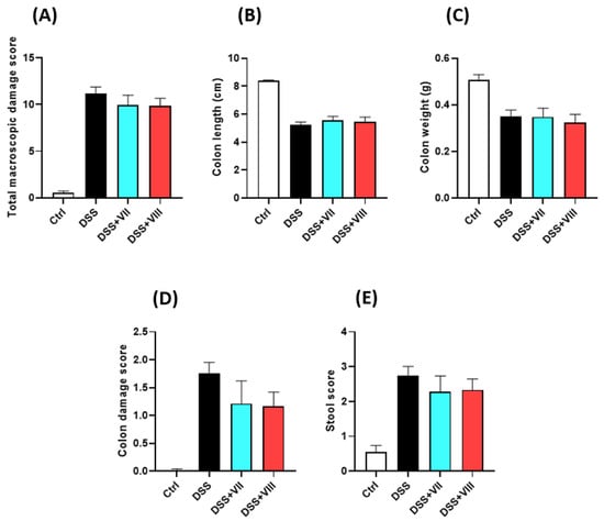 The effect of the peptides on colonic inflammation in DSS-induced mouse model of colitis: total macroscopic damage score (A), colon length (B), colon weight (C), colon damage score (D), and stool score (E) for control, DSS-only treated mice, and mice with DSS-induced colitis treated with 1 mg/kg peptide VII or peptide VIII twice daily. Data represent mean ± SEM of n = 5–10 animals per group.