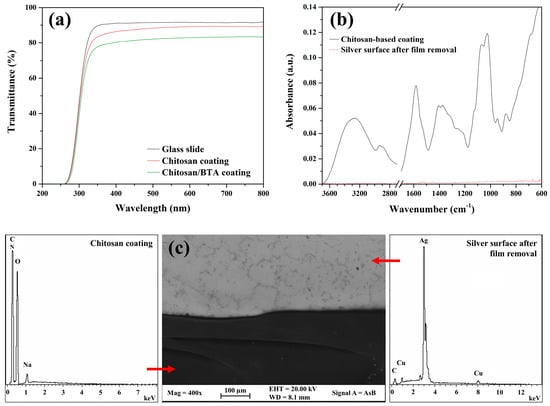 Figure 1). The high values of transmittance and the flat trend in the region of visible light (380–780 nm) confirm that chitosan-based coatings totally fulfill transparency and absence of color, respectively. Moreover, they are completely water soluble and totally biocompatible. These features represent a very important property for an easy and safe application by conservators. They can be applied on silver substrates (e.g., by brushing or spraying) and can be easily removed at any time without the need for chemical hoods or protective devices. When the need of coating removal arises in fact, a simple gauze, soaked in water or ethanol, is enough to take the coating off, without leaving any visible residues of the film on the silver surface. In addition, chitosan-based coatings applied on silver artifacts can be touched and handled without any risks of the film’s failure.