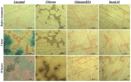 33]. After one hour of treatment, the differences between the coated and uncoated surfaces were very pronounced. The disks covered with the protective coatings did not change, whereas the bare disk underwent deep color modifications attributable to the growth of corrosion products on its surface. Carrying out the treatment up to ten hours, some differences between chitosan and chitosan/BTA-coated surfaces started to be visually detectable. Concerning the disk covered with the pure chitosan film, a brown halo formed along the copper dispersions, which in turn became darker. On the contrary, the disk covered by chitosan/BTA did not undergo noticeable changes and its surfaces remained cleaned such as those covered by the commercial reference coating (