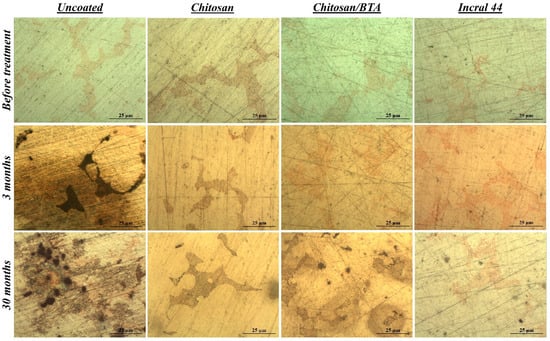 Figure 2, optical microscopy images of the disks’ surfaces, both bare and coated with chitosan, chitosan/BTA and Incral 44 films, are reported for different times of aging. Before the treatment, the surface of every sample appeared smooth, clean and characterized by two coexisting phases: a silver-rich matrix and embedded copper-rich orange dispersions. Such heterogeneity, invisible to the naked eye, makes this alloy highly reactive and explains the characteristic alteration mechanism observed on the bare surfaces (