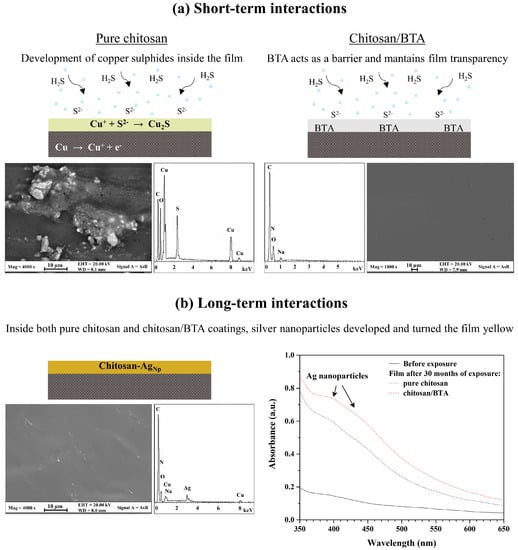 24]. In our experiments, significant percentages of copper were found in the pure chitosan coating after the accelerated aging treatment and in both chitosan and chitosan/BTA coatings after prolonged exposure in the wooden box. The ability of copper to migrate and diffuse inside the chitosan-based coatings is thus confirmed. But while copper migration inside the protective film was promoted even from a few hours of aggressive treatment, silver migration, diffusion and nucleation were favored only for longer periods of aging. Time was also found to be a crucial factor in determining the effects of BTA addition on silver surfaces’ passivation. According to the experiments’ results, in the short-term the presence of benzotriazole had a positive effect in the protection of the metal surface. The high affinity toward copper dispersions, which at this stage represented the most reactive site of the whole alloy, protected the element from migration and reaction with sulfur inside the coating. In the long-term, the benzotriazole’s negative effects on silver surfaces became dominant. It is likely that the metal/inhibitor bonds weakened or that the Cu-BTA and especially the Ag-BTA complexes turned soluble, leading to the migration of both the elements inside the overlying film. As suggested by absorption peaks in the UV-Vis spectra that are more pronounced for the chitosan/BTA coating compared to the pure chitosan film (