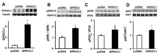 The transient transfection with the GPR37L1 plasmid increased the expression of GPR37L1 (8.7 ± 0.5-fold), compared to mock-transfected cells (Figure 7A). The expression of GPR37L1 increased the phosphorylation of ERK1/2, PI3K, and AKT at S473 (Figure 7B–D), confirming that GPR37L1 signals through ERK1/2/PI3K/AKT.