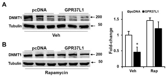 GPR37L1 decreases DNMT1 expression through mTOR. The hRPTCs, transfected with GPR37l1 or control plasmid (pcDNA), were treated with vehicle (Veh) or rapamycin (50 nM [Rap], for 24 h). (A,B) Protein preparations from the hRPTCs were immunoblotted for DNMT1. Quantification of DNMT1 expression normalized by tubulin. n = 3/group, * p < 0.05 vs. pcDNA+Veh, t-test.