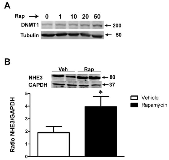 Rapamycin treatment increases DNMT1 and NHE3 expression in hRPTCs. Cells were treated with rapamycin at the concentrations of 1, 10, 20, and 50 nM or vehicle for 24 h. The expression of DNMT1 was determined by Western blot. Quantification was normalized by tubulin expression. The molecular size markers are indicated on the left. Another set of hRPTCs were treated for 24 h with 50 nM rapamycin or vehicle, and the expression of NHE3 of the cell lysates was determined by Western blot. Quantification was normalized by GAPDH. The molecular size markers are indicated on the left. n = 3/group * p < 0.05 vs. vehicle.