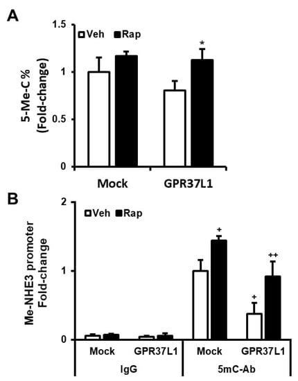 GPR37L1 inhibits genomic DNA methylation. (A) Genomic DNA prepared form hRPTCs expressing GPR37L1-GFP were analyzed for 5-cytosine methylation using EZ DNA Methylation-Gold Kit (Zymo Research, Irvine, CA, USA). n = 3/group, * p < 0.05 vs. GPR37L1/Veh, t-test. (B) Methylation status of NHE3 promoter region was determined by methylated DNA immunoprecipitation followed by quantitative PCR. n = 3/group, + p < 0.05 vs. 5mC-Ab/Mock/Veh, t-test. ++ p < 0.05 vs. 5mC-Ab/GPR37L1/Veh, t-test.