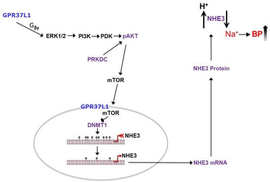 Our data showed that in RPTCs, GPR37L1 signaled via the ERK1/2/PI3K/AKT/mTOR pathway and increased the transcription of NHE3 through a DNMT1-mediated decrease in the methylation of the NHE3 promoter. The integrated proposed pathway of GPR37L1 effect on NHE3 expression from the plasma membrane to the nucleus is shown in Figure 11.