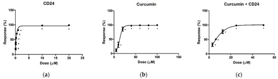 Finally, the cytotoxicity of CD24, curcumin alone, and CD24 in combination with curcumin was assessed towards HEK293 cell lines, by using the range of concentrations 70–0.5 µM. In both cases, no cytotoxic effects were observed up to 70 µM.