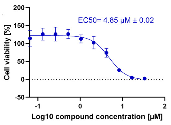 Considering our previously recorded activity of CD24 [29] and curcumin [31] alone against T. brucei brucei (Table 3), we decided to test the two inhibitors in combination (molar ratio 1:1) by obtaining EC50 = 4.85 ± 0.02 µM (Figure 5). Overall, the obtained data led us to assume that the use of our synthetic inhibitor CD24 in combination with curcumin led to an improvement of its antitrypanosomal activity (EC50s = 10.1 ± 0.5 µM [29] vs. 4.85 ± 0.02 µM), thus suggesting a fruitful use of the drugs in combination.