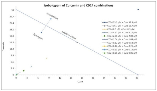 In a subsequent experiment, five data points were established for both compounds (1/4 × IC50, 1/2 × IC50, IC50, 2 × IC50, and 4 × IC50, Table 1), with the aim of evaluating if a synergistic, additive, or antagonist effect occurred in the combination study of the inhibitors. In this assay, the combination of CD24 and curcumin (molar ratio 1:62) provided an IC50 value of 5.6 ± 0.4 µM.