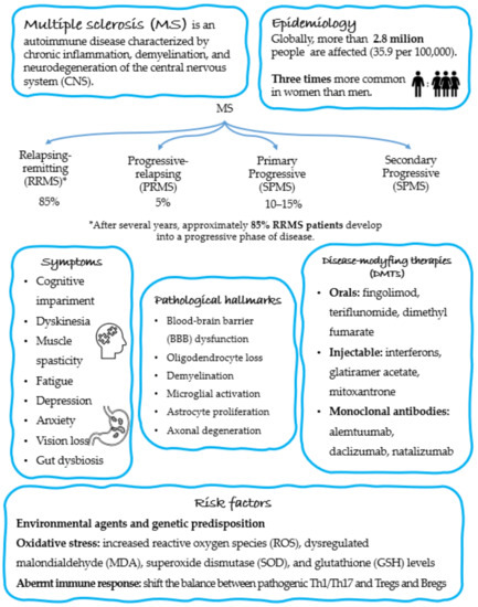 MS is an autoimmune disease characterized by chronic inflammation, demyelination, and neurodegeneration of the CNS [35]. Up to 2.8 million people worldwide suffer from MS (35.9 per 100,000 population), and its prevalence has raised in every world region annually [36]. MS affects young adults between 20 and 40 years old, but it can onset at any age. Furthermore, women are more susceptible to MS, at a commonly reported ratio of 3:1 over men or even higher [37]. In most relapsing-remitting (RRMS) patients (approximately 85%), after several years, develop into a progressive phase of MS, which is characterized by an irreversible disability and continuous disease progression without remission [38].