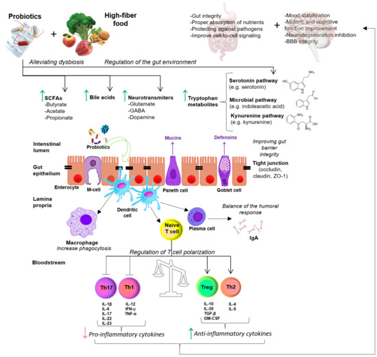 Potential favorable effects of probiotic supplementation on the molecular mechanisms of MS pathogenesis. Probiotics supplementation as well as high-fiber food intake, may affects the gut microflora and inhibit the increment of pathogens by inducing the host’s production of defensin and IgA by Goblet cells and plasma cells, respectively. Supplementation with appropriate amounts of probiotics causes an increase in intermediate metabolites, neurotransmitters (e.g., GABA, glutamate, and dopamine), SCFAs, and bile acids, which have a positive effect on the functioning of the intestines (e.g., proper absorption of nutrients) and the functioning of the brain (e.g., activation of serotonin and kynurenine pathways). Probiotics may be able to strengthen the gut barrier by maintaining tight junctions (e.g., occludin, zonulin, and claudin) and inducing mucin formation by Paneth cells. Probiotics via dendritic cell stimulation may regulate CD4+ T cell polarization and differentiation, leading to the production of pro-inflammatory (IL-1β, IL-6, IL-12, IL-17, IL-22, IL-23, and TNF-α) or anti-inflammatory (IL-4, IL-5, IL-10, IL-35, TGF-β, and GM-CSF) cytokines. Abbreviations: BBB—blood-brain barrier; GABA—gamma-aminobutyric acid; GM-CSF—Granulocyte-macrophage colony-stimulating factor; IFN-γ—interferon γ; IgA—immunoglobulin A; SCFAs—short-chain fatty acids; Th—helper T cells; IL—interleukin; TNF-α—tumor necrosis factor α; TGF-β—transforming growth factor β; ZO-1—zonula occludens-1.