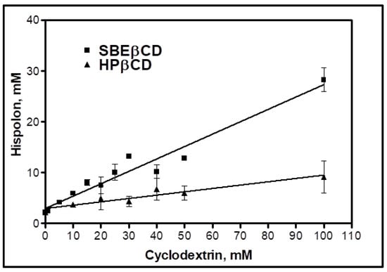 Phase solubility diagram of Hispolon and Sulfobutylether-β-cyclodextrin (SBEβCD) or Hydroxypropyl-β-cyclodextrin (HPβCD).