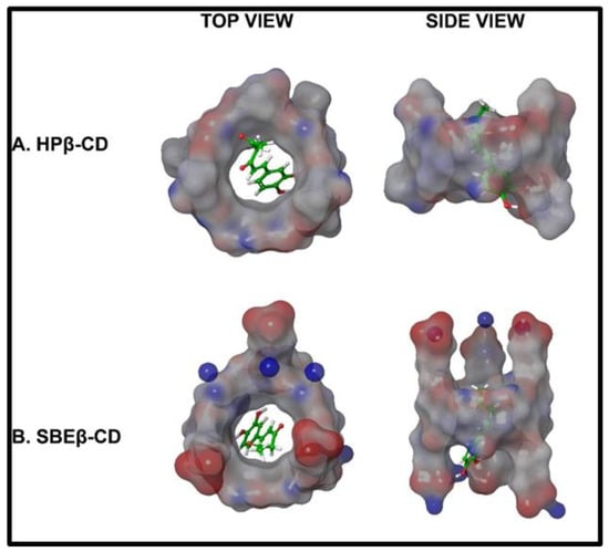 The selection of SBEβCD was further confirmed by using molecular modeling by ligand docking. Representative docked images (top and side view) for both cyclodextrins with hispolon are shown in Figure 2. Cyclodextrins form truncated cone like structures, in which chains, like sulfobutyl ether, increase the length of the tunnel for drug inclusion, which was validated by the docking score of −3.826. The docking scores of hispolon for different cyclodextrins are expressed in Table 2. The in-silico molecular models of docked images in Figure 2 show that the phenolic ring was aligned inside the tunnel of cyclodextrin, which correlated with increased metabolic stability, as well as improved stability when compared to the free drug, as confirmed by previous reports for other molecules of limited water solubility [,]. The binding at the inclusion complex primarily involved hydrogen bonding interaction of the hydroxyl group of hispolon with SBEβCD.