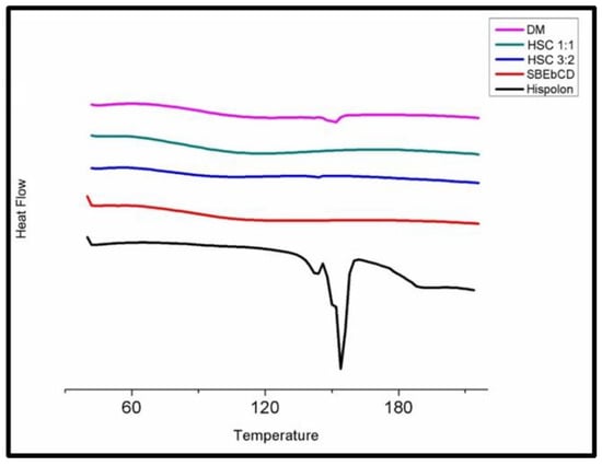 The comparison of thermograms, shown in Figure 3, illustrates the thermal behavior of hispolon due to complexation. The DSC thermogram of hispolon showed a characteristic endothermic peak at 154 °C, which corresponded to the melting point. The SBEβCD exhibited a broad endothermic peak from 60 to 140 °C, associated with dehydration, presumably with the loss of adsorbed water molecules. Based on the Job’s plot analysis results, 0.4 and 0.5 molar ratios, i.e., 3:2 and 1:1 stoichiometric ratio of hispolon and SBEβCD, were employed to prepare the freeze-dried inclusion complexes. The 3:2 HSC complex showed a remnant drug peak at 144 °C, shifted from the original 154 °C. The 1:1 HSC complex showed the disappearance of the characteristic peak of hispolon, indicating that in the 1:1 HSC complex, the drug was included within the cylindrical cone of the CD cavity to form an inclusion complex. The dry mixture (DM) in the same molar ratio showed a distinct hispolon peak at 152 °C. The broad endothermic peak matched between HSC and SBEβCD, but the disappearance of the primary drug peak supported the possibility of interactions between hispolon and SBEβCD, due to inclusion complexation.
