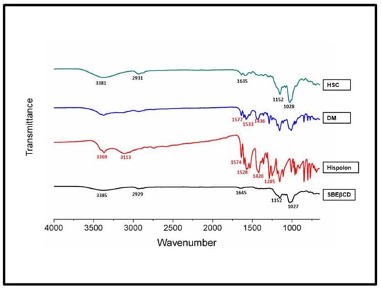 Fourier Transform (FTIR) spectra of the inclusion complex and pure components. HSC: Hispolon-SBEβCD complex, DM: Dry Mixture, SBEβCD: Sulfobutylether-β-cyclodextrin with 3:2 molar ratio.