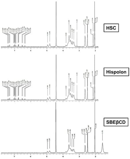 Proton NMR (Nuclear Magnetic Resonance) spectra of inclusion complex and pure components. HSC: Hispolon SBEβCD complex, DM: Dry mixture, SBEβCD: Sulfobutylether-β-cyclodextrin.