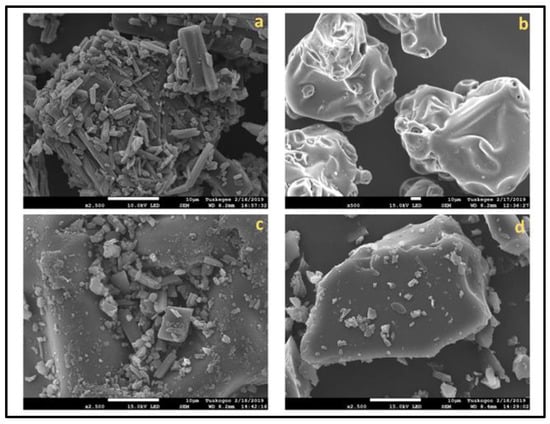 Scanning electron microscopic images of powders of inclusion complexes and pure components. (a) Hispolon, (b) Sulfobutylether-β-cyclodextrin (SBEβCD), (c) Dry mixture, and (d) HSC (Hispolon-SBEβCD) complex.