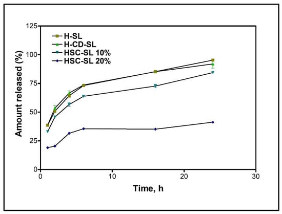 Figure 7 demonstrates the nature of hispolon release from the dialysis bag for H-SL, H-CD-SL, HSC-SL-10%, and HSC-SL-20% formulations at physiological pH 7.4 ± 0.1 at 37 °C ± 0.2. The comparison was made between the conventionally made sterically stabilized H-SL liposomes, SBEβCD in hispolon liposomes (H-CD-SL), and HSC in liposomes (HSC-SL:10% & 20%). H-SL and H-CD-SL showed quick drug release in the first 6 h reaching 73.2 ± 0.89% and 73.6 ± 1.2%. HSC-SL batches with 10% hispolon showed better control up to 63.8 ± 0.38% release after 6 h, whereas HSC-SL-20% surprisingly sustained the drug and released 35.6% in 6 h. H-SL and H-CD-SL released 95.3 ± 0.66% and 92.0 ± 3.8% of hispolon by 24 h, respectively, whereas the HSC entrapped liposomal formulations showed 84% and 42% release for HSC-SL-10% and HSC-SL-20%. The drug loading was increased, keeping the phospholipid and cholesterol content constant. Similar alteration of drug loading and cyclodextrin, by Lin et al., showed improved retention of the drug inside tumor cells using butylidenephtalide cyclodextrin complexes inside glioblastoma cells []. Chen et al. demonstrated that hydrophobic drugs, like indomethacin, once trapped inside an aqueous core, result in stable encapsulation, and interaction between the drug and bilayers could be avoided to prolong the hydrophobic drug release []. Liposomes trapping stable complexes could allow encapsulation of both free drugs and complexed drugs, which could, eventually, improve the potency and duration of the drug’s therapeutic effect [].
