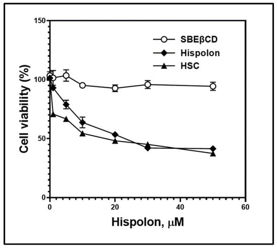 Recent studies have shown that hispolon is effective against cancers like melanoma in vitro [,]. Despite having potent cytotoxic activity against different types of cancer cells, hispolon was, however, found to be non-toxic against macrophages when treated at doses below 10μM []. Similar evidence was observed in another study, where hispolon showed preferential cytotoxicity and apoptosis selectively against gastric cancer cells (SGC-7901), MGC-803 and MKN-45) without inducing any cytotoxicity and apoptosis in normal gastric cells (GES-1), suggesting it was a safe compound for living cells []. For our study, we investigated the influence of complexation with SBEβCD on the in vitro anticancer activity against B16BL6 melanoma cell lines using an MTT cell cytotoxicity test. There are previous reports that studied utilization of SBEβCD complexation to increase the overall anticancer efficacy against tumor cell lines [,]. Venuti et al. illustrated that SBEβCD alone elicited no significant anticancer activity, but with the complexation of resveratrol, a significant change in cytotoxicity to MCF-7 cell lines occurred []. Cutrignelli et al. published a report showing that complexation with SBEβCD positively influenced the anticancer and antioxidant activity of a hydrophobic active []. Another report by Shukla et al. demonstrated that an SBEβCD complexed drug significantly enhanced cytotoxicity against large cell carcinoma with a notable reduction in the IC50 values of the formulation [].