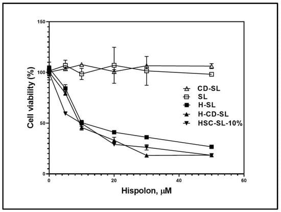 Cytotoxic effect of various concentrations (0.5–50 µM), of hispolon against B16BL6 cell lines. Formulations tested: Sterically stabilized liposomes (SL), Hispolon Sterically Stabilized Liposomes (H-SL), Blank SBEβCD Liposomes (CD-SL), Hispolon SBEβCD in-process complexation in Liposomes (H-CD-SL), Hispolon Cyclodextrin complex in Liposomes (HSC-SL).