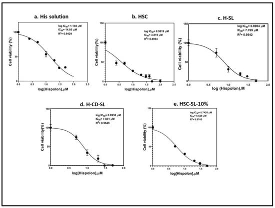 Comparison of IC50 values of five different formulations: (a) His Solution, (b) HSC, (c) H-SL, (d) H-CD-SL and (e) HSC-SL-10%. Cells were treated with different concentrations (50 µM, 30 µM, 10 µM, 5 µM, 1 µM, 0.5 µM) of hispolon in each formulation for 48 h, and cell viability was measured using the MTT assay. Cell grown in media were considered as control (100%). Data represented as Mean ± SEM for each experiment with n = 3.