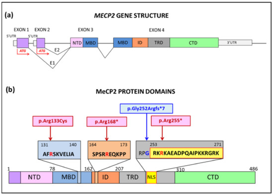MECP2 gene (MIM #300005), mapping at Xq28, encodes the transcription regulator and chromatin remodeler methyl-CpG-binding protein 2 (MeCP2), which is ubiquitously expressed, but at particularly high levels in post-mitotic neurons in the brain [1,2,3,4]. Due to the key role of MECP2 in the function of neuronal cells, pathogenic variants in heterozygous females and rarely in hemizygous males are the most common cause of the rare (1:10,000 live births) neurodevelopmental Rett syndrome (RTT MIM #312750). RTT is characterized by early developmental regression leading to loss of language, purposeful use of the hands, onset of typical stereotypies, gait abnormalities, seizures, apnea, hyperventilation, and autonomic dysfunction [5]. A further common feature in RTT patients is post-natal microcephaly, also observed in animal models, where the reduced brain volume has been associated with abnormal morphology of neurons, which show reduced dendritic branching, soma size, spine density, and synapse number [6,7].