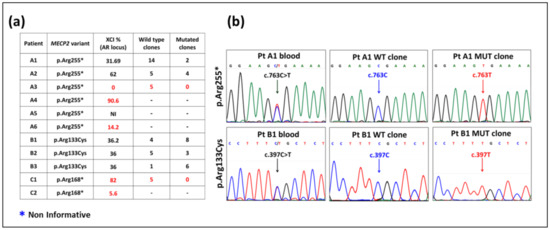Eight hot-spot mutations (R106W, R133C, T158M, R168*, R255*, R270*, R294*, and R306C) account for more than 60% of typical RTT cases [9]. A consistent clinical heterogeneity with a strong genotype-phenotype correlation is reported in the literature indicating that early-truncating pathogenic variants, such as R168*, R255*, R270*, and large deletions are associated with a more severe phenotype than R294*, R133C, R306C, and late-truncating C-terminal variants [10]. MECP2 being subject to X chromosome inactivation (XCI), further clinical expressivity is determined in RTT females by the variable ratio of the two cell populations expressing the wild-type (WT) and the mutant (Mut) allele [11].