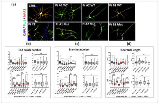 The box-plots in Figure 5 display a significant decrease in the number of end points b and branches c, and a reduced neuronal length d in all mutant clones. Supplementary Figure S2a shows the data from the two clones of PtY (p.Gly252Argfs*7) and PtA1 (p.Arg255*), pointing out that the technical replicates behave similarly in almost all parameters, with significant deregulation when compared to controls. Less severe alterations were evidenced for i-neurons with p.Arg133Cys missense mutation (PtB1 Mut, PtB2 Mut, and PtB3 Mut). Four comparisons were made for each parameter (Figure 5b–d). All mutant clones were compared with a pool of healthy controls (upper-left box-plots). PtA1, PtA2, and PtB1 were also compared with their specific isogenic WT clones (bottom-left). No statistical significance (ns) was found among the WT clones (bottom-right graphs) which also appeared similar to the CTRL pool (upper-right).