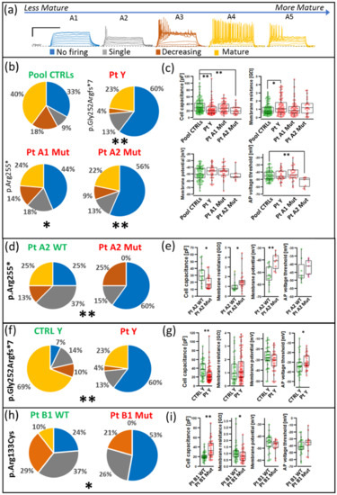 To strengthen our data, we also performed the following comparisons. First, considering that the cells carrying the Gly252Argfs*7 mutation derived from a male patient, we compared it with a control male group (Figure 6f,g). The two distributions were significantly different (Mann–Whitney test, PtY vs. CTRL-Y p < 0.01) confirming the strong phenotype present in cells with this mutation. Then, in Figure 6d,e we compared one of the two cases carrying the Arg255* mutation with its isogenic WT clone confirming the different firing pattern induced by the mutation (Mann–Whitney test, PtA2 Mut vs. Isogenic WT p < 0.01). Third, we exploited the availability of the isogenic control for the PtB1 patient to test whether the spiking behaviour and other functional properties of PtB1 cells are also different from isogenic controls. The chi-square test revealed a significantly different distribution of spiking pattern (p < 0.01, Figure 6h), and cell capacitance and membrane resistance (p < 0.05 Figure 6i).