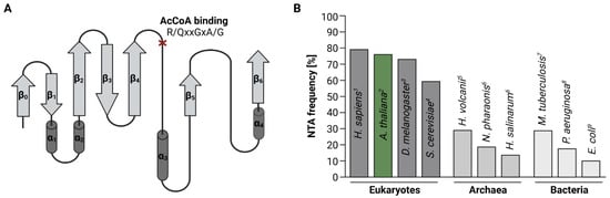 The typical GNAT fold is conserved throughout all domains of life. (A) The core GNAT fold consists of six to seven β-strands (β0–β6, light grey) and four α-helices (α1–α4, dark grey). The loop connecting β4 and α3 contains a conserved AcCoA binding motif (R/QxxGxA/G, red cross). Differences between GNAT structures are generally confined to the N-terminal β0 strand. (B) NTA frequency in different organisms as a percentage of the whole proteome. The bars represent the estimated upper limit reported for the individual organisms (1: [23], 2: [20], 3: [24], 4: [25], 5: [26], 6: [27], 7: [28], 8: [29] and 9: [30]).
