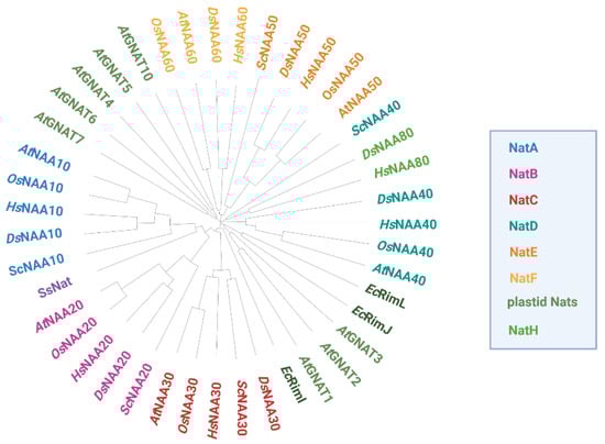 Phylogenetic tree of Nats from different domains of life based on protein sequence comparison. Homologous Nat sequences from the photosynthetic eukaryotes Arabidopsis thaliana (At) and Oryza sativa (Os), the non-photosynthetic eukaryotes Homo sapiens (Hs), Drosophila melanogaster (Ds) and Saccharomyces cerevisiae (Sc), as well as the bacterium Escherichia coli (Ec) and the archaeon Saccharolobus solfataricus (Ss) were aligned with ClustalW. For OsNAA50 and OsNAA60, only one protein could be identified by blasting the respective human orthologs against the rice proteome. The resulting phylogenetic tree was circularized with the iTOL tool (https://itol.embl.de, accessed on 20 October 2022).