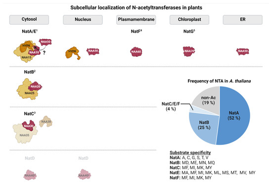Subcellular localization and substrate specificity of N-acetyltransferases in the model plant Arabidopsis thaliana. Catalytic subunits are schematically represented in red, whereas auxiliary subunits are depicted in orange. Subunits for which only predictions of subcellular localization are available are shown in lighter colors. From the plastid Nat family only NatG is shown for simplicity (1: [20,44,50,51,52]; 2: [47]; 3: [45]; 4: [46]; 5: [21,22], ?: debated in Arabidopsis). The pie chart shows the relative contribution of the individual acetyltransferases to the plant acetylome. Estimates are based on experimental data where acetyltransferases were assigned to acetylated N-termini based on their substrate specificity [20,53].